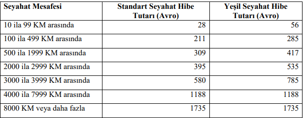 Mesafe hesaplayıcısı aracılığı ile personelin Malatya Turgut Özal Üniversitesi ile faaliyetin gerçekleştirildiği kurumun bulunduğu yer olan iki nokta arasının km değeri tespit edilmeli ve aşağıdaki tablo kullanılarak seyahat hibesi hesaplanmalıdır. Mesafe hesaplayıcıda çıkan kilometrenin aşağıdaki tablodaki hibe karşılığı gidiş-dönüş rakamı olup, söz konusu miktar ikiyle çarpılmaz. Personelin aktarmalı olarak seyahat etmesi, yukarıda belirtilen mesafe hesaplaması ile varılan mesafeyi etkilemez. Personelin şehir içi ulaşıma ait seyahat giderleri karşılanmaz. Kişi bu giderlerini kendisine verilen günlük/haftalık hibeden karşılamak durumundadır.