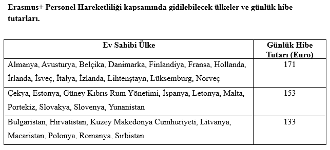 Personel hareketliliğinden faydalanacak personele verilecek olan günlük/haftalık hibe miktarı gidilen ülke ile birlikte gidilen süreye göre aşağıdaki tabloda belirtilen tutarlar dikkate alınarak hesaplanır. Hareketlilikten yararlanacak personele; 5 faaliyet günü ve 2 gün yol olmak üzere 7 günlük hibe ödemesi yapılır. Tabloda gösterilen miktarlar Avro cinsindendir.